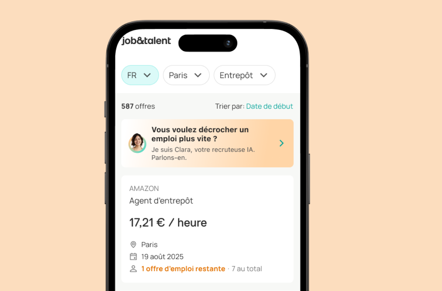 Clara est l'agente de recrutement IA de Job&Talent. Elle fait passer des entretiens, sélectionne et place les meilleurs candidats pour vous, plus rapidement que jamais.