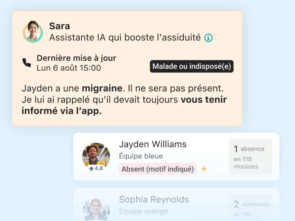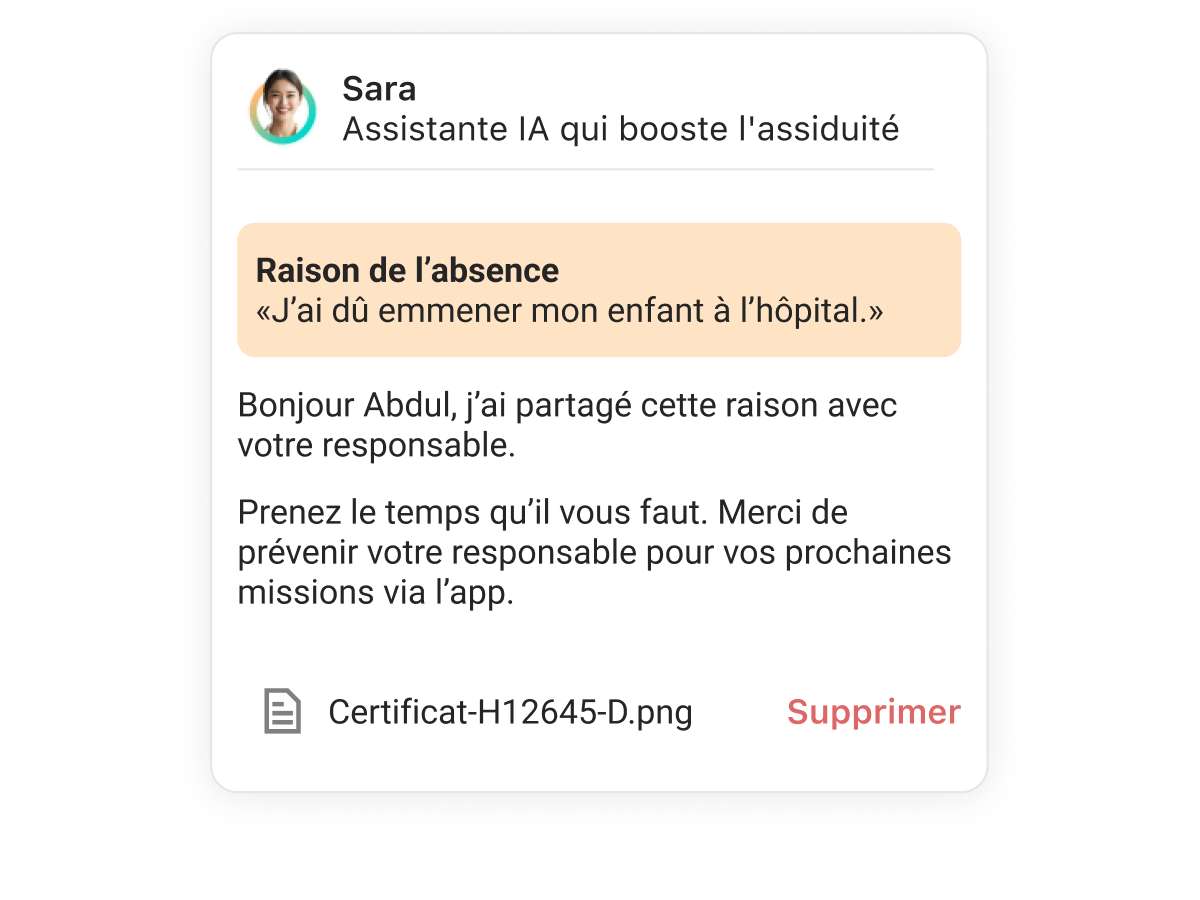 Sara est une assistante IA qui booste l'assiduité qui contacte automatiquement l’intérimaire lorsqu’il n’effectue pas son pointage d’arrivée dans l’application. Elle contacte l'intérimaire, demande la raison et partage le résultat avec le manager, le tout en temps réel.