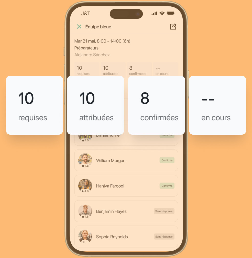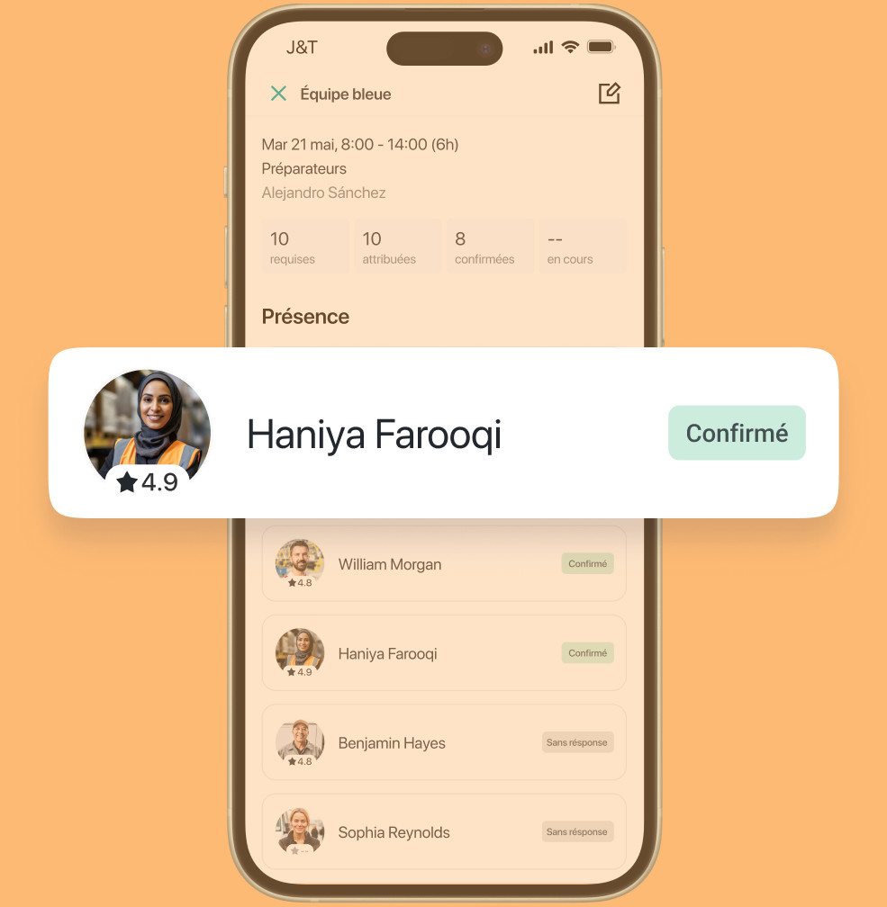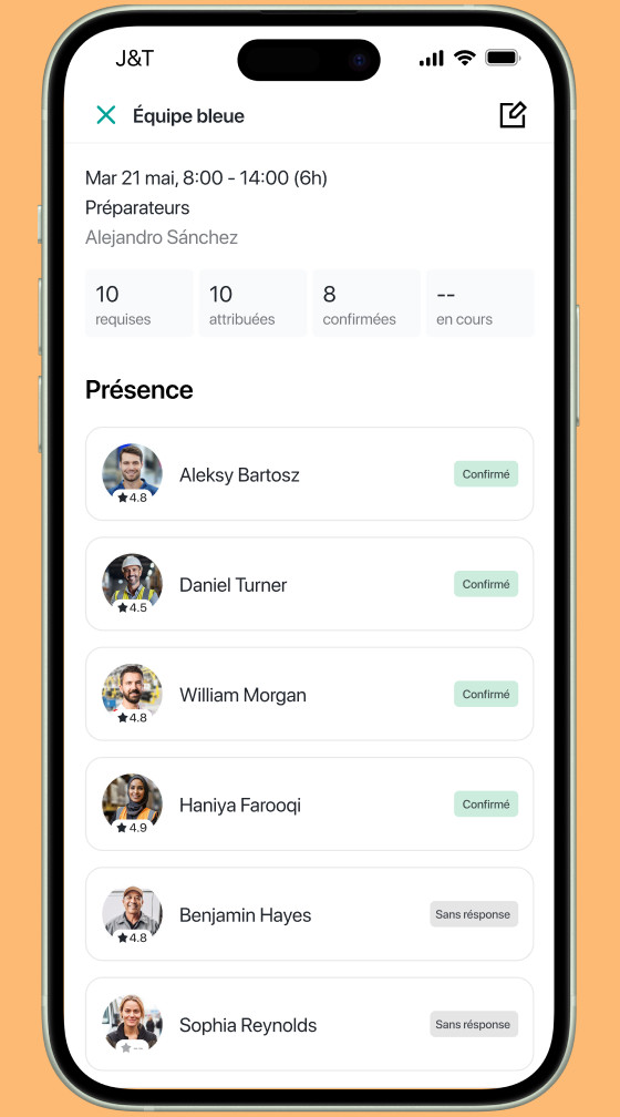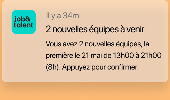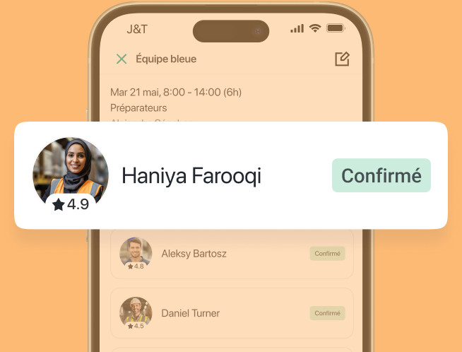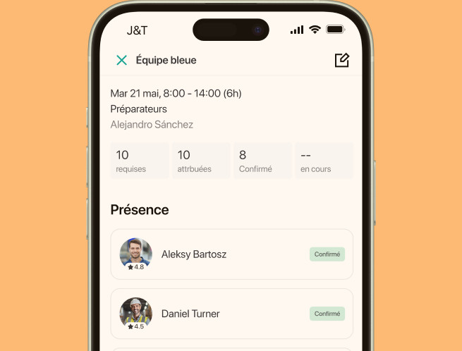 Les chefs d'équipe mettent en place des équipes et attribuent des tâches en quelques clics dans l'application Job&Talent Business. Les travailleurs sont ensuite informés dans l'application de la mission qui leur est destinée. Lorsqu'ils l'accepte, le chef d'équipe reçoit immédiatement la réponse. Vous êtes ainsi assuré que votre demande est satisfaite.