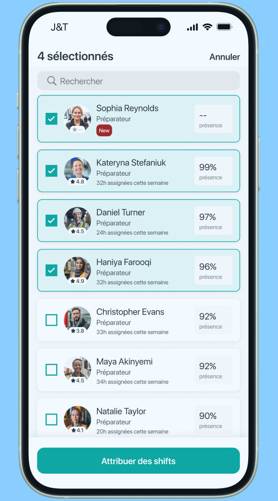 La plate-forme offre également une gestion des équipes, garantissant une expérience de gestion des effectifs cohérente et conforme. Nos produits technologiques intégrés incluent une application pour les chefs d'équipes, pour l'administration et pour les travailleurs. Elles sont constamment synchronisées pour que tout le monde soit aligné.