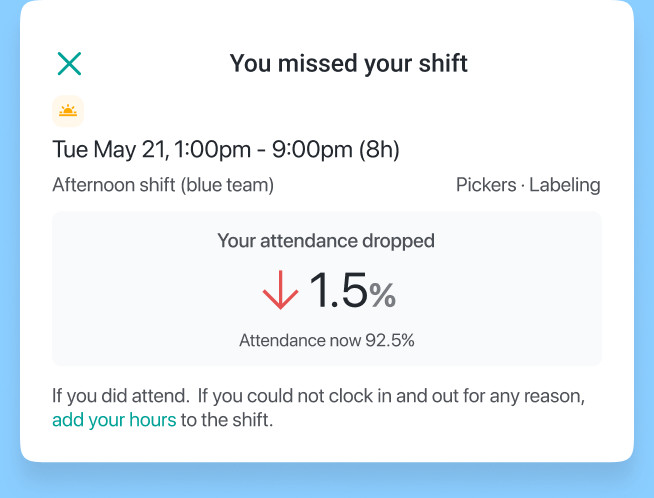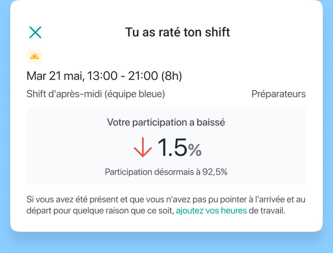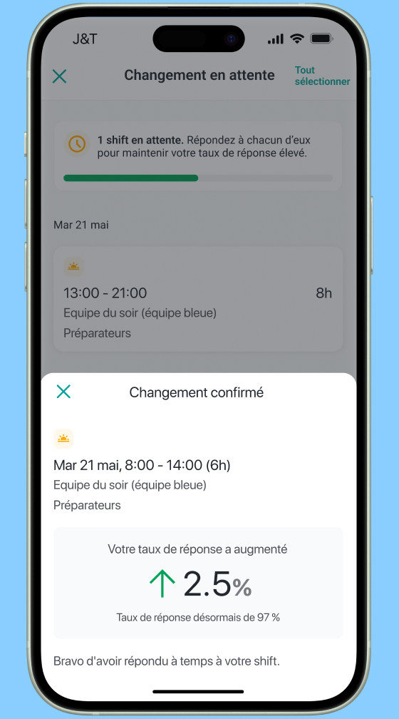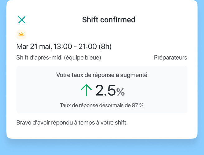 Vous pouvez configurer les changements d'équipe jusqu'au début du shift. Gérez la date et l'heure ainsi que les personnes qui y travaillent. Toutes les personnes concernées sont averties en cas de changement, de sorte que tout le monde reste informé.